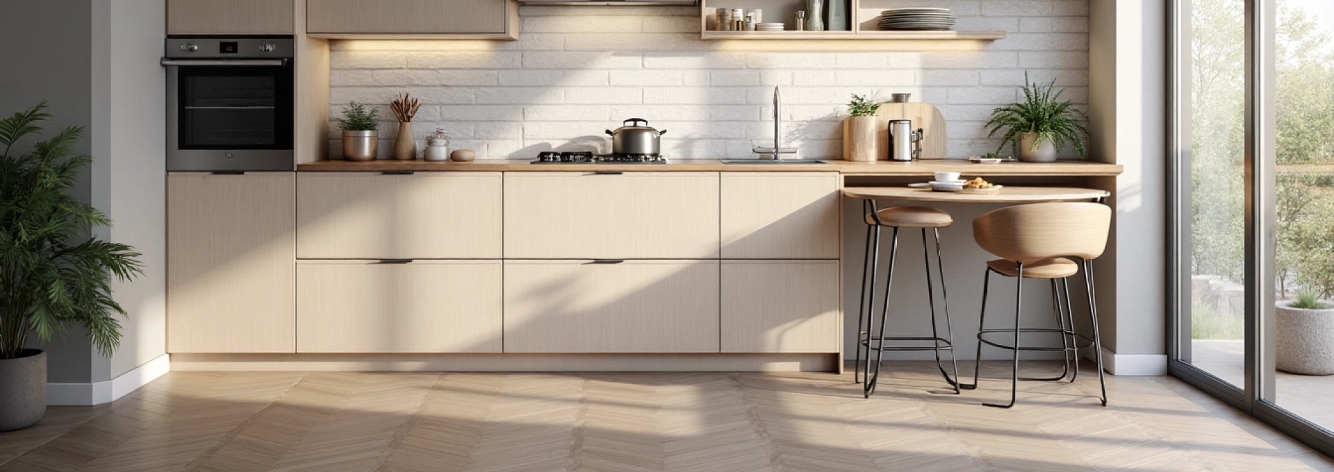 Un exemple brillant de mobilier multifonctionnel est la table escamotable intégrée au plan de travail. Lorsqu’elle est repliée, elle se fond dans le décor, libérant un espace précieux pour la préparation des repas. Dépliée, elle offre une surface de repas confortable pour deux à quatre personnes. Cette flexibilité permet d’adapter rapidement l’espace aux besoins du moment, qu’il s’agisse de cuisiner ou de dîner.